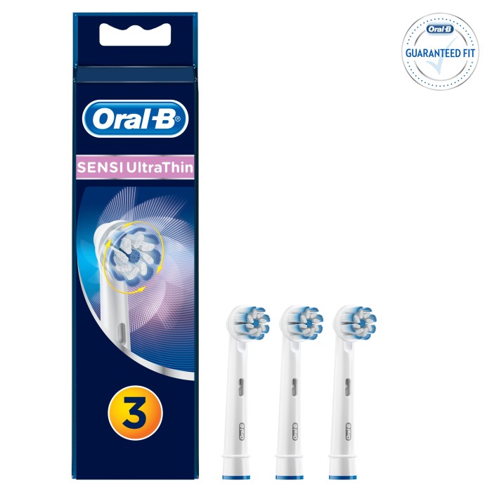 Oral-B Sensi UltraThin borsthuvud har en rund utformning och är framtagen i samarbete med tandläkare. Tandborsthuvudet kombinerar mjuka, ultratunna borststrån som är skonsamma mot tandköttet och vanliga borststrån som är tuffa mot plack. Oral-B Sensi Ultrathin har avrundade borststrån och passar för alla med en känslig mun och skonsam rengöring.