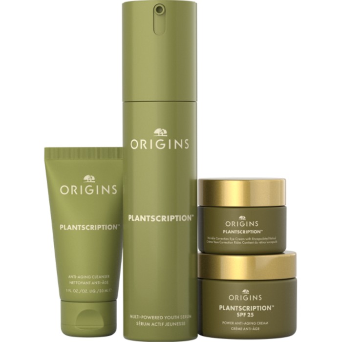 Origins Plantscription Youthful Essentials Gift Set är en presentförpackning med produkter för en ungdomlig hud. Kitet innehåller ordinarie storlekar av Origins Multi-Powered Youth Serum och Wrinkle Reduction Retinol Eye Cream, samt reseförpackningar av Anti-Aging Cleanser och Anti-Aging Cream SPF25.