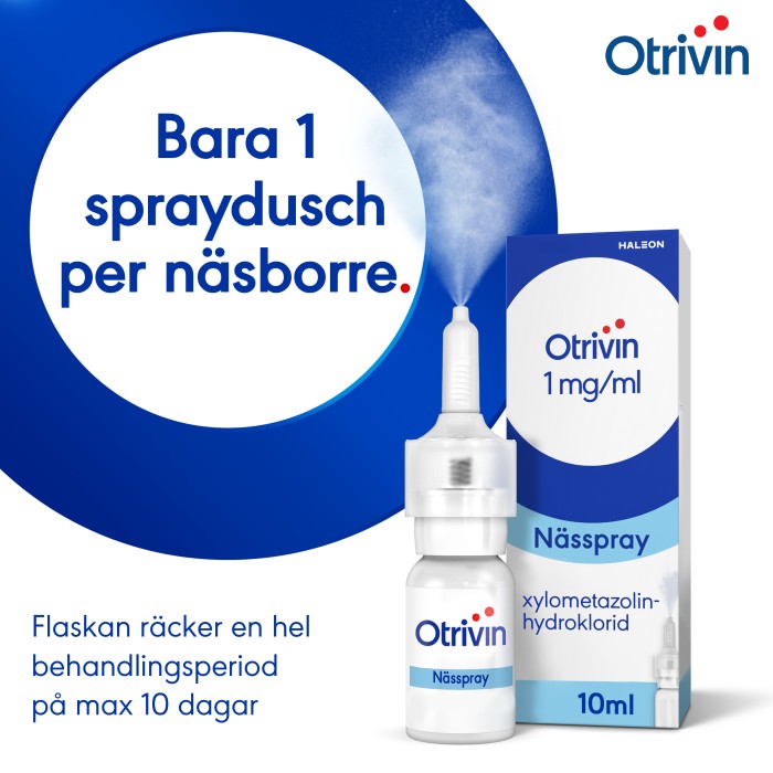 Otrivin 1 mg/ml bör inte användas längre än 10 dagar i följd och rekommenderas från 12 år. Innehåller konserveringsmedel.