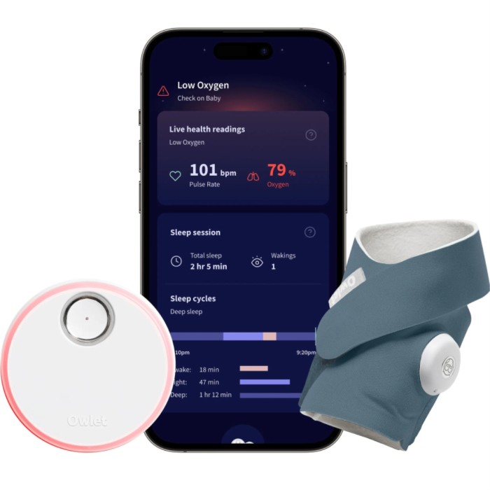 Owlet Dream Sock är en medicinskt godkänd babymonitor som mäter barnets puls och syresättning i realtid. Den mjuka sockan fästs enkelt runt barnets fot och skickar data direkt till Owlet-appen i din mobil – så att du kan känna dig trygg med att ha koll på barnet när det sover. Vid avvikelser får du tydliga aviseringar, och du kan följa sömntrender och välmående över tid. (Mobiltelefon ingår inte.)