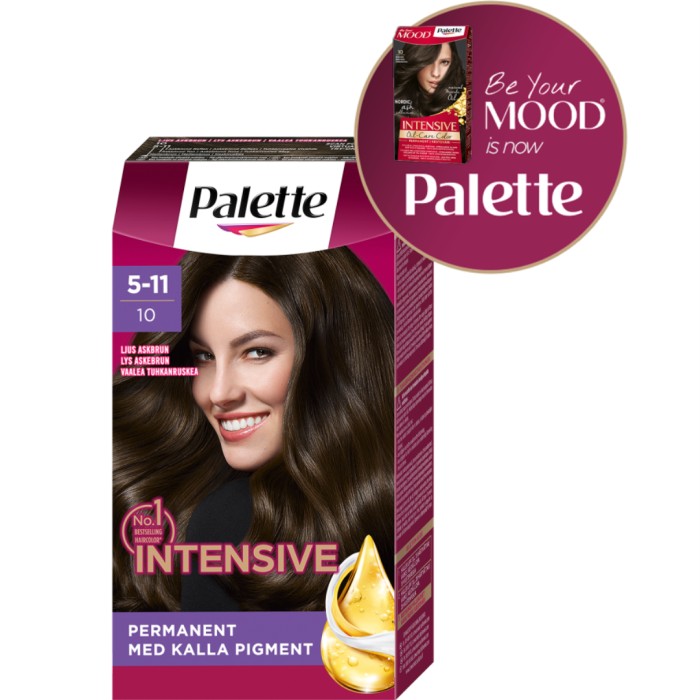MOOD Palette heter nu bara Palette! Palette Intensive Creme Coloration 5-11 Ljus Askbrun permanent hårfärg med 100 % gråhårstäckning. Intensive Creme Coloration har en fyllig olje-i-kräm-formulering som tränger in i håret med högkoncentrerade pigment för 100 % gråhårstäckning och ger långvarig färglyster fram till nästa färgning. Med en specialutvecklad fuktbevarande behandling som återfuktar håret på djupet och ger en silkeslen känsla. Den silikonfria formuleringen gör håret mjukare, mer lättkammat och ger glans. Ingredienserna i denna Palette hårfärg är upp till 93 % av naturligt ursprung*.