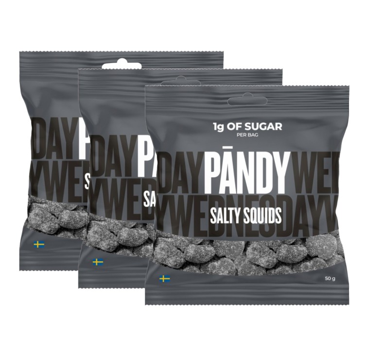 Pändy Candy Salty Squids är ett skumgodis i form av små salta bläckfiskar. Detta skumgodis från Pändy har en smak av saltlakrits. Innehåller endast 1 gram socker per påse.