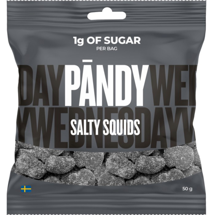 Pändy Candy Salty Squids är ett skumgodis i form av små salta bläckfiskar. Detta skumgodis från Pändy har en smak av saltlakrits. Innehåller endast 1 gram socker per påse.