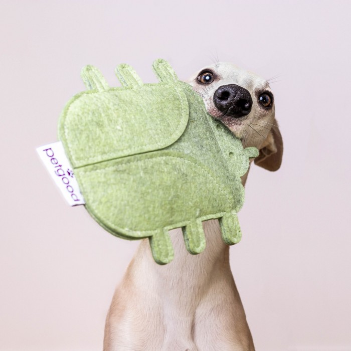Petgoods hundleksak är tillverkad av filtmaterial från återvunna textiler. Hundleksaken tillverkas i EU i samarbete med ett företag som främjar ett socialt, hållbart och cirkulärt samhälle genom att återanvända resurser och hjälpa människor ut på arbetsmarknaden.
