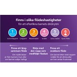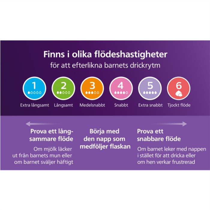 Dinappen finns med 6 olika flödeshastigheter. Anpassa flaskan efter din bebis och välj den dinapp som passar ditt barns behov. Ju högre nummer du väljer desto lättare flödar mjölken när bebisen suger. Nr 1 har lågt flöde och passar bebisar som har stark sugkraft eller som behöver ha långsamt flöde.