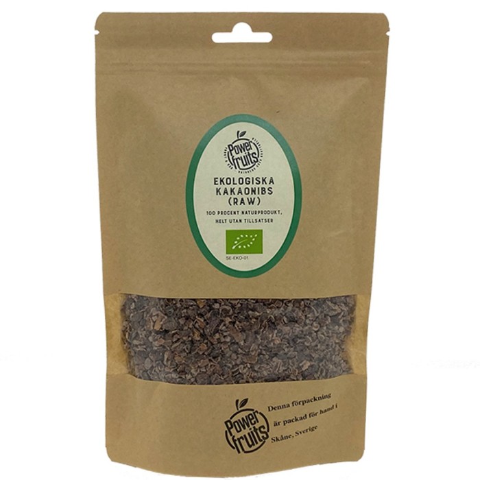 Powerfruits kakaonibs är ekologiska och raw. Kakaonibsen innehåller teobromin, som är besläktat med koffein och teofyllin.