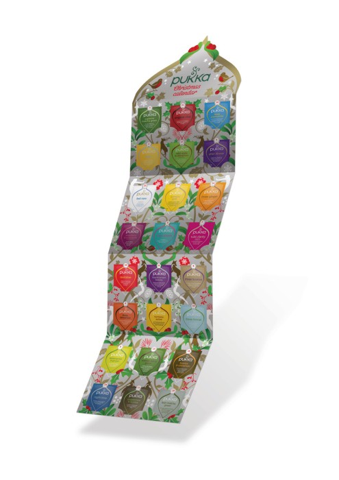 Starta varje morgon under december (fram till jul) med en ny te-sort! Julkalendern innehåller 24 påsar ekologiskt örtte, grönt te och fruktte utvalda ur Pukkas sortiment.