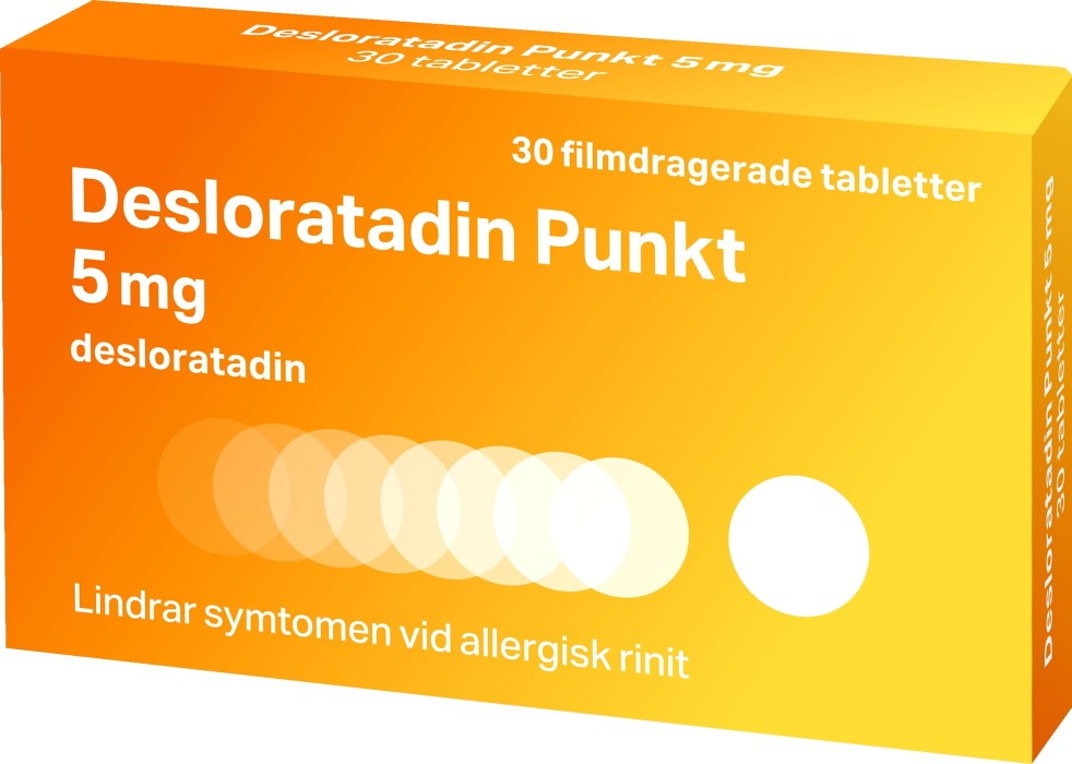 Desloratadin Punkt är ett antihistamin som lindrar symtom vid allergisk rinit, utan att ge ökad trötthet eller dåsighet. Om du är allergisk och besväras av nysningar, rinnsnuva, klåda i gommen eller röda och kliande ögon kan Desloratadin Punkt ge effektiv hjälp. Effekten varar hela dagen och hjälper dig att upprätthålla normala vardagssysslor och och normal sömn. Desloratadin Punkt kan användas av vuxna och ungdomar från 12 år.