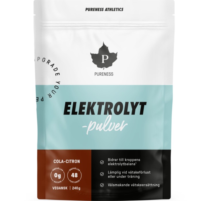 Pureness Elektrolytpulver Cola-Citron är ett elektrolytpulver som kan hjälpa till att upprätthålla balansen mellan de nödvändiga elektrolyterna i vår kropp. Elektrolytpulvret har en smak av cola och och citron och fungerar som vätskeersättning. Tillskott av elektrolyter kan tas när man förlorar mycket vatten ur kroppen, till exempel vid långa sportpass, bastubadande, varma sommardagar eller då man svettas mycket.