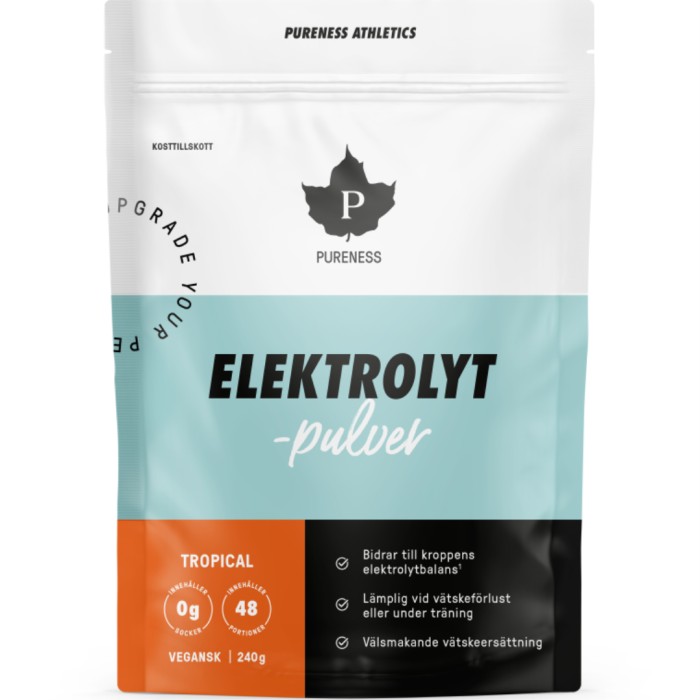 Pureness Elektrolytpulver Tropical är ett sockerfritt pulver som innehåller bland annat magnesium som bidrar till upprätthållandet av elektrolytbalansen i kroppen. Förutom elektrolyter och magnesium innehåller pulvret Guérande-havssalt, organiskt svavel (OptiMSM) och C-vitamin. C-vitamin bidrar till att bibehålla immunsystemets normala funktion under och efter intensiv fysisk träning.