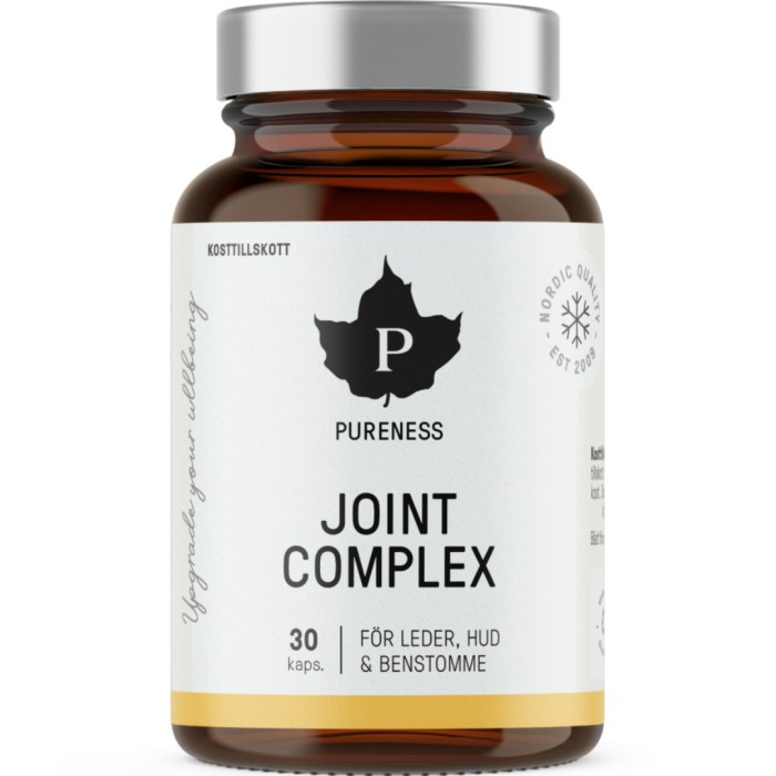 Pureness Joint Complex är ett kosttillskott med gurkmeja, mangan, C-vitamin och UC-II® kollagen. Kollagenet som använts i Pureness Joint Complex är ett patenterat, kliniskt testat kollagen som härstammar från fågel. Kollagenet går under namnet UC-II® och är ett odenaturerat kollagen vilket innebär att den är i sin naturliga form utan värmebehandling eller kemisk bearbetning.