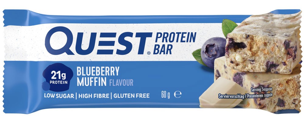 QuestBar Blueberry Muffin är en proteinbar med smak av blåbärsmuffin. En QuestBar kan tas i samband med träning eller som ett mellamål. En bar innehåller 21 gram protein och 15 g fibrer och innehåller inget tillsatt socker. Denna bar innehåller torkade blåbär.