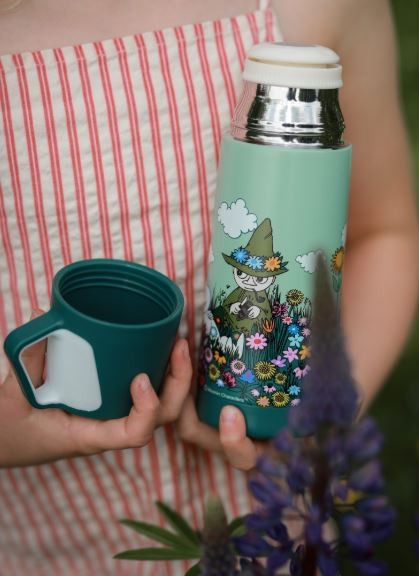 Söt termos i rostfritt stål med Mumin-motiv. Barn-termosen rymmer 350 ml varm eller kall vätska och passar bra både på vinterutflykten och att ta med till stranden. Den tillhörande muggen är i gummerad plast. Termosen håller värmen (eller kylan) upp till 10 timmar. För barn från 36 månader.