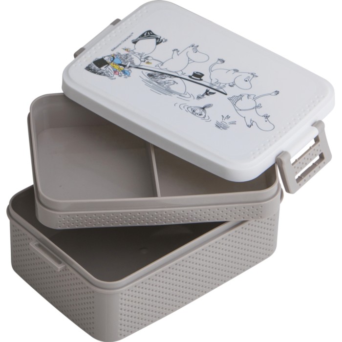 Fin och praktisk lunchlåda för barn med Mumin-motiv. Lunchlådan har en mellanbricka med två fack samt ett lock med knäppen. Du kan välja om du vill ha med avdelaren eller inte, locket går att spänna i två olika lägen.