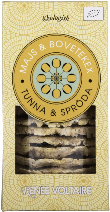Renée Voltaire Majs & Bovetekex är krispiga och ekologiska kex gjorda på majs och bovete - ingenting annat!