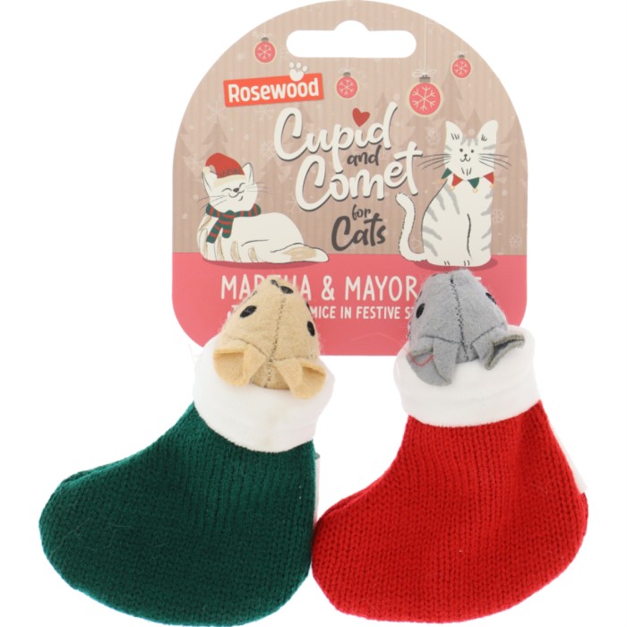 Rosewood Martha & Mayor Mice Duo kattleksak. Två plyschmöss i ullstil gömda i stickade strumpor. Mössen innehåller kattmynta.