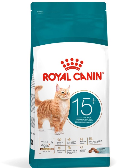 ROYAL CANIN® AGEING 15+ är ett torrfoder lämpligt för katter från 15 års ålder. ROYAL CANIN® AGEING 15+ är utformad för och testad på seniorkatter med tuggvänliga foderbitar som ger katten en njutningsfull måltidsupplevelse. Denna sammansättning är också mycket smaklig.*