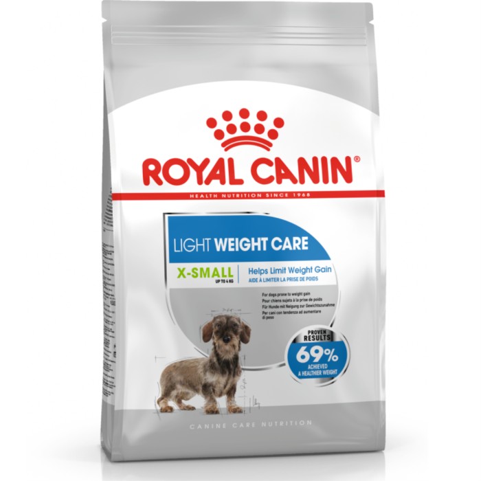 ROYAL CANIN® Light Weight Care X-Small är lämpligt för hundar med en ideal vikt på upp till 4 kg. När man minskar ner på det totala antalet kalorier minskas också ofta mängden protein hunden får i sig. Det kan leda till att din hund förlorar muskler istället för fett. Alla Royal Canins foder innehåller mycket smältbara proteiner.För att hjälpa din hund att hålla en hälsosam vikt innehåller våra foder anpassade nivåer av fett och kalorier. Fett har ett högt energiinnehåll, hela 9 kalorier per gram, vilket är nästan dubbelt så mycket som för proteiner och kolhydrater.En optimal kombination av lösliga och olösliga kostfibrer, bland andra psyllium, bidrar till att din hund känner sig mätt. Royal Canins foder säkerställer också en regelbunden tarmpassage och bidrar till att upprätthålla en hälsosam tarmflora i tjocktarmen.
