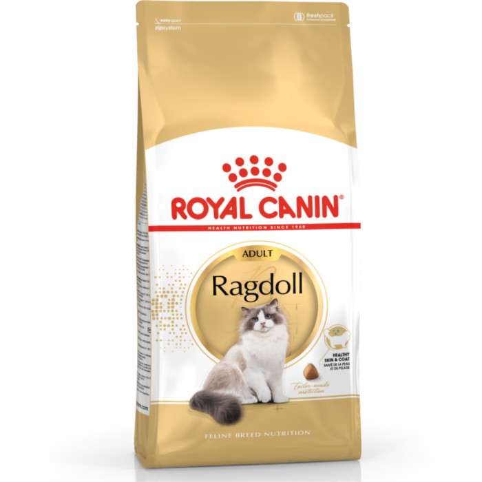 Ragdoll är en stilig katt med fängslande ögon och en mjuk, silkeslen päls. Rasen ragdoll är storvuxen och kärleksfull med en tillgiven och social karaktär. ROYAL CANIN® Ragdoll Adult torrfoder bidrar till att bibehålla en hälsosam hud och päls genom en kombination av specifika näringsämnen, bland annat aminosyror, vitaminer och både omega 3- och omega 6-fettsyror. ROYAL CANIN® Ragdoll Adult foder innehåller hög andel taurin för att stödja en hälsosam hjärtfunktion hos din katt.