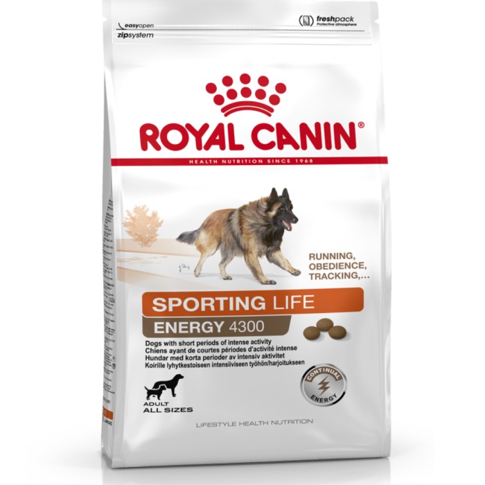 Royal Canin Sporting Life Energy 4300 Adult är ett torrfoder för hund, ett helfoder anpassat för vuxna hundar med långa perioder av oavbruten aktivitet.