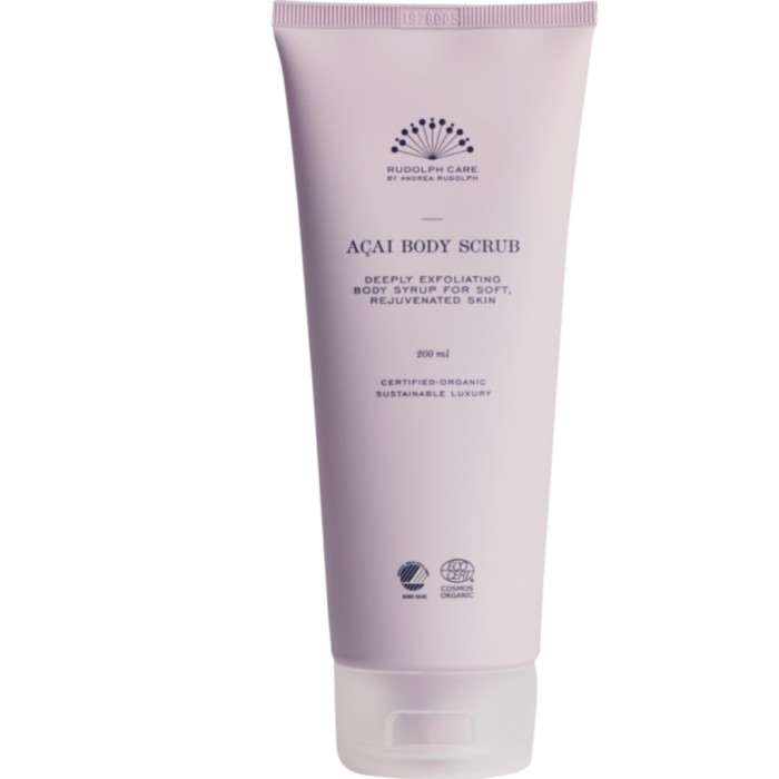 Açai Body Scrub från Rudolph Care är en kroppsskrubb med finmalda granulat från aprikoskärnor som varsamt skrubbar bort orenheter och döda hudceller, och stimulerar på så sätt cellförnyelsen. Peelingen innehåller ekologiska oljor av raps, aprikos och oliver för att öka hudens spänst och tillföra näring till huden, som efter exfoliering är extra mottaglig för vård och fukt. Açai Body Scrub gör huden slät, jämn och len med ger den ny lyster.