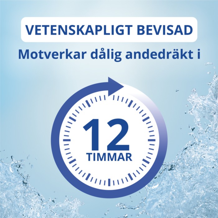 - Säkerställer god andedräkt i upp till 12 timmar.