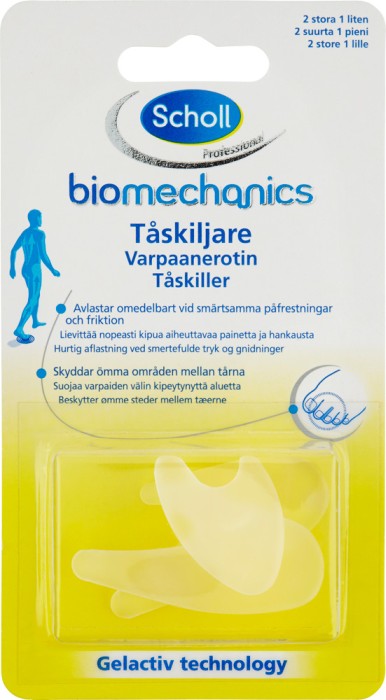 Scholls tunna tåskiljare är ergonomiskt utformade för att bekvämt passa mellan tårna. Tåskiljarna ger avlastning för hoptryckta och sneda tår.
