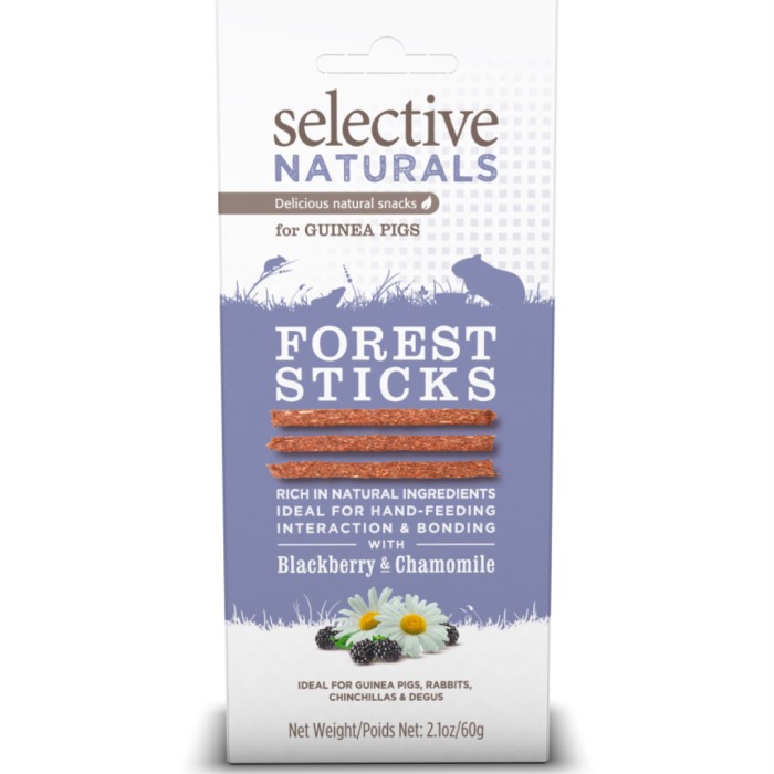 Selective Forest Sticks är snacks med smak av björnbär och kamomill för kaniner, marsvin, chinchilla och degu. Naturligt godis med hög fiberhalt. Innehåller inget tillsatt socker eller kemiska färgämnen. Med linfröolja för en blank päls.
