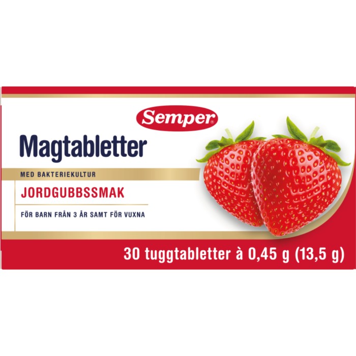 Semper Magtabletter är tuggtabletter med levande bakteriekultur. Magtabletterna är ett kosttillskott med den patenterade, naturliga mjölksyrabakterien Limosilactobacillus reuteri Protectis®, som trivs i och är anpassad till miljön i matsmältningskanalen. Tuggtabletter med smak av jordgubb. För barn från 3 år och vuxna.