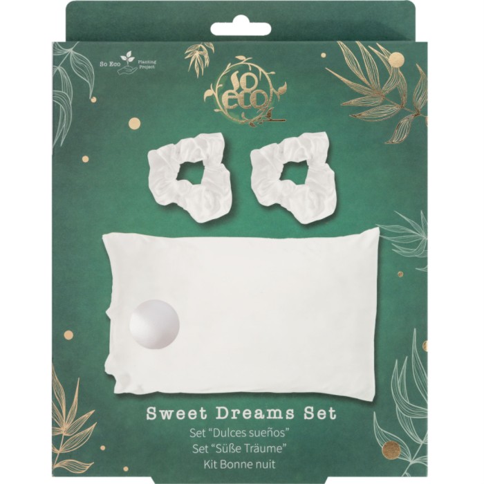 So Eco Sweet Dreams Set är ett set i mjuk satin i polyestermaterial, med produkter som minskar friktion och slitage på håret när du sover, samtidigt som de är skonsamma mot huden. Setet innehåller ett örngott i satin samt två fluffiga scrunchies som ger en känsla av lyx till din kvällsrutin. Kan användas för att uppgradera din sovupplevelse, och vakna upp med mjukare hår.