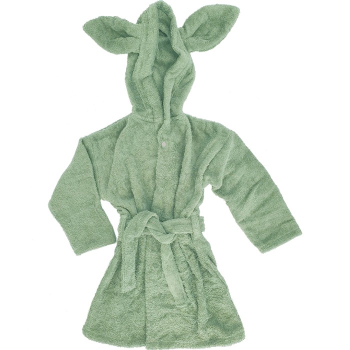 Summerville Badrock Rabbit är en mjuk och mysig badrock med luva med kaninöron. Badrocken för barn är gjord i skön ekologisk bomullsfrotté som är snällt mot huden. Badrocken passar bra att använda både hemma efter badet och på stranden. Badrocken har en knapp överst vid halsringningen för att sitta bra och hålla sig stängd. Midjebandet är fastsytt bak på ryggen för att inte tappas. Badrocken har en rejäl hängare för enkel upphängning på en krok. Tillverkad i 100% ekologisk bomullsfrotté.
