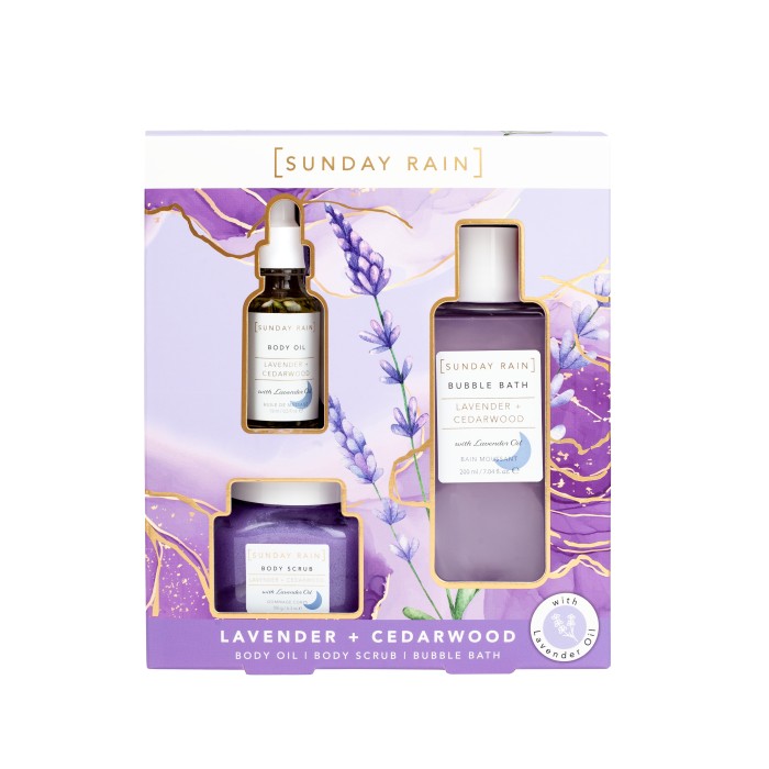 Sunday Rain Lavender & Cedarwood Relax Trio är ett kit med en kroppsolja, en body scrub och ett skumbad med doft av lavendel. Perfekt för att varva ner efter en lång dag.