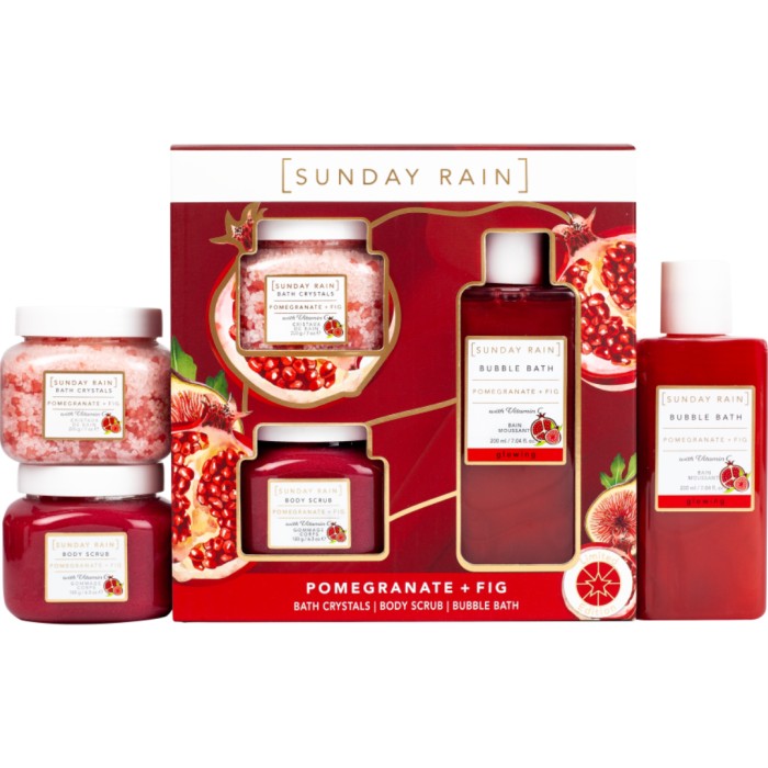 Sunday Rain Pomegranate & Fig Trio är ett kit för en lyxig kroppsvårdsritual med antioxidantrikt granatäpple och återfuktande fikon för en mjuk hud med lyster.