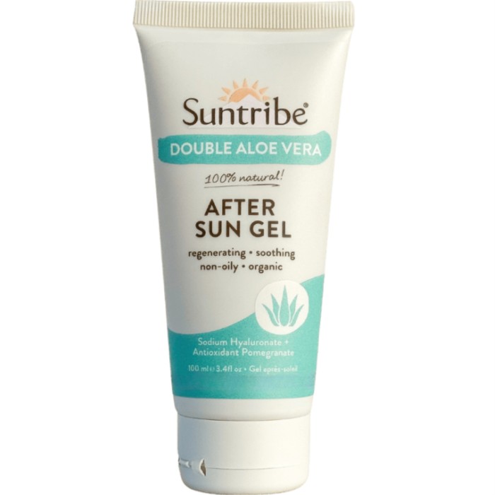 Suntribe After Sun Gel Aloe Vera är en svalkande och återfuktande gel med aloe vera. Aloe vera lugnar och svalkar huden snabbt och känns skön på huden efter solexponering. Den lätta och flytande gelen känns inte klibbig på huden. Gelen innehåller ekologisk jojobaolja och natriumhyaluronat för att återställa fukt i huden som gått förlorad efter en dag i solen. Gör huden fräsch och lugnad.