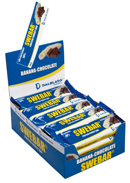 Swebar Bananchoklad är en proteinbar som passar bra att ta som återhämtning efter ett träningspass. Swebar innehåller Dalblads proteinblandning ”Three in one”, som bygger på tre olika proteinkällor där vassleprotein utgör grunden. Proteinkällan absorberas snabbt och når musklerna omedelbart och förser musklerna med aminosyror som behövs för reparation och uppbyggnad.