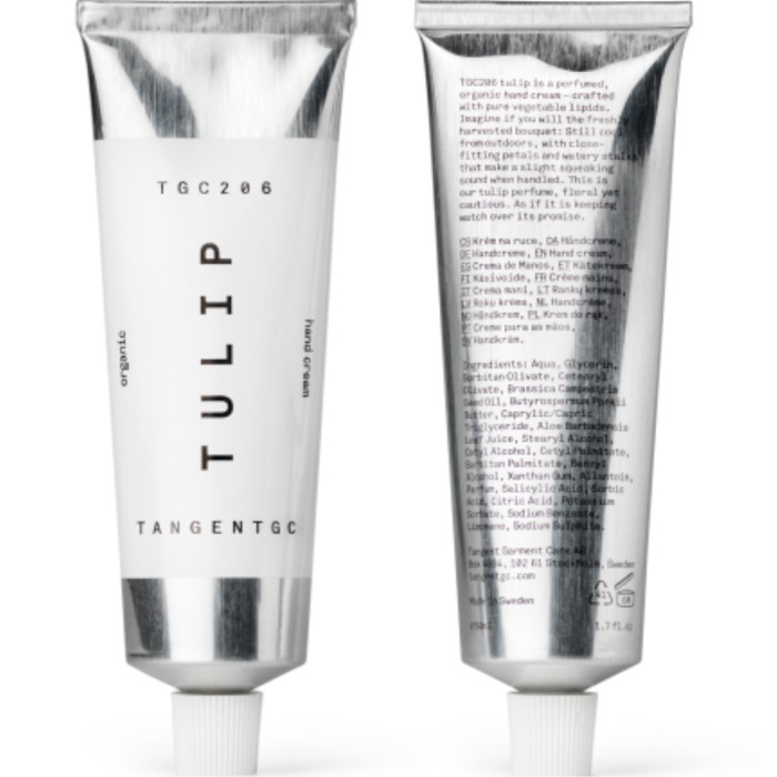 Tangent GC Tulip Hand Cream är en väldoftande handkräm som snabbt går in i huden. Handkrämen innehåller vegetabiliskt squalene som vårdar torr hud och triglycerider från kokosolja som ger huden lyster. Krämen innehåller även E-vitamin och glycerin, samt sojabönolja som återfuktar och reducerar ålderstecken kopplade till hyperpigmentering.