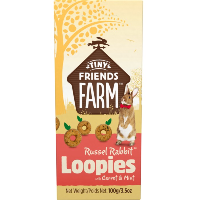 Tiny Friends Farm Russel Rabbit Loopies är godbitar med smak av morot och pepparmynta utformade speciellt för kaniner. Detta är ett komplement till din kanins vanliga foder och erbjuder en extra smakupplevelse. Använd dessa godbitar för att leka lekar eller göm dem i din kanins hem för att få den att leta upp godbitarna.