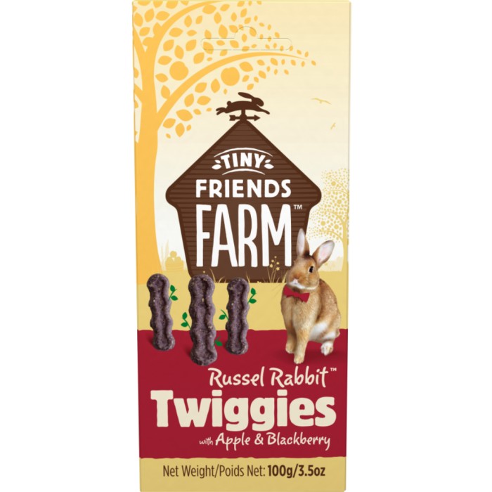 Tiny Friends Farm Russel Rabbit Twiggies är godbitar med smak av äpple och björnbär utformade speciellt för kaniner. De är ett komplement till din kanins vanliga foder och erbjuder en extra smakupplevelse. Använd dessa godbitar för att leka lekar eller göm dem i din kanins hem för att få den att leta upp godbitarna. Kanske kan motverka tristess och en uttråkad kanin.