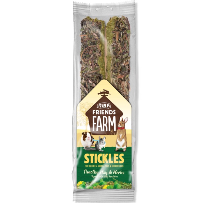 Tiny Friends Farm Stickles med smak av timotejhö och örter är en godbit för kaniner, marsvin och chinchillor. Innehåller naturliga ingredienser och är berikade med hö och örter med vitaminer och antioxidanter som stödjer ditt djurs hälsa. Fritt från konstgjorda tillsatser, en säker och näringsrik godbit för ditt smådjur. Den krispiga texturen hjälper till att hålla ditt smådjurs tänder i gott skick genom naturlig gnagning. Passar som ett mellanmål, belöning eller aktivitetsgodis för kaniner, marsvin och chinchillor.