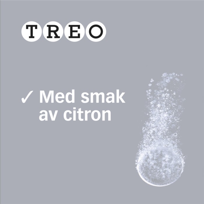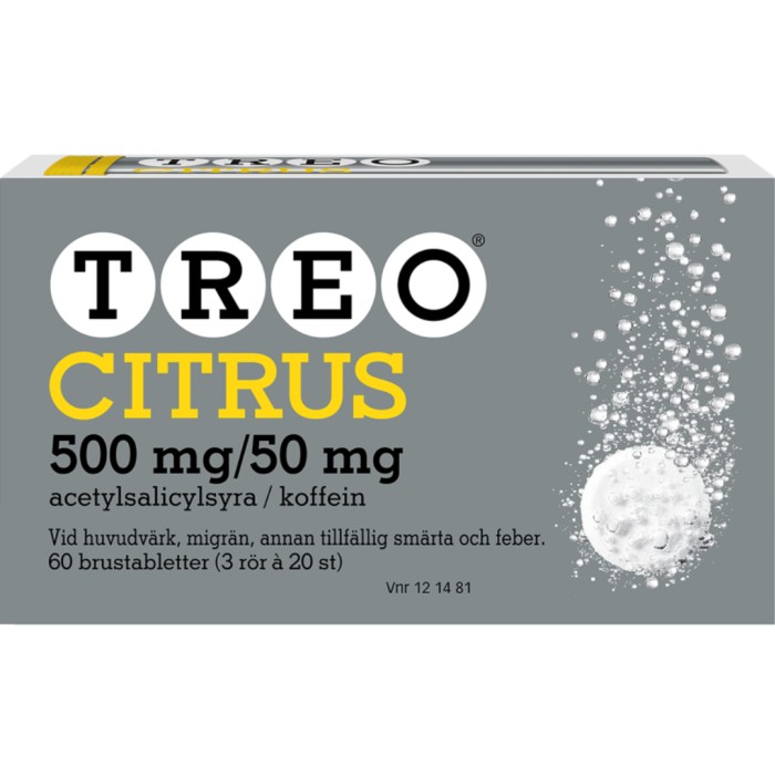 Vuxna och ungdomar över 14 år: 1-2 tabletter 1-3 gånger per dygn eller enligt läkares föreskrift, högst 6 tabletter per dygn. Mer än 2 brustabletter åt gången ger ej bättre smärtstillande effekt. Kontakta läkaren om symptomen försämras eller inte förbättras inom 3 dagar vid feber och migrän och inom 5 dagar vid smärta Användning för barn Treo Citrus ska inte ges till barn under 14 år. Varning: Ska inte ges till personer under 18 år med feber utan att läkare tillfrågats beroende på risken för uppkomst av Reyes syndrom, ett sällsynt men allvarligt sjukdomstillstånd. Brustabletten ska lösas i ett ½ glas vatten. Använd inte Treo Om du fått överkänslighetsreaktioner såsom astma, andningssvårigheter, hösnuva eller nässelfeber vid användning av acetylsalicylsyra eller vissa andra läkemedel mot inflammation. Treo Citrus ska inte heller användas av dem som har magsår, blödarsjuka, minskat antal blodplättar (trombocytopeni), skrumplever, svår hjärtsvikt eller svår njursjukdom. Gravida kvinnor ska inte använda Treo under de tre sista månaderna av graviditeten. Intag av Treo ska undvikas av kvinnor som planerar graviditet eller är gravida. Behandling under någon del av graviditeten skall endast ske efter läkares ordination