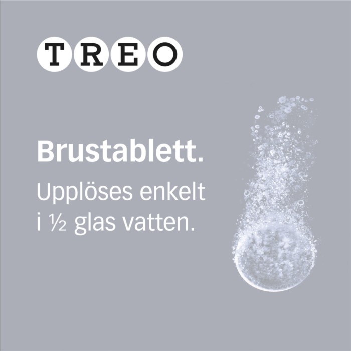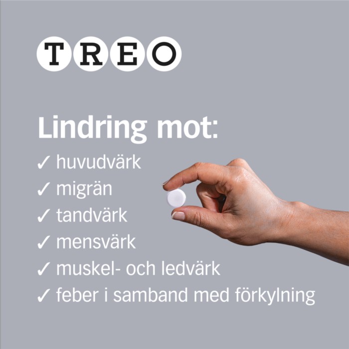 Treo är ett receptfritt läkemedel, en värktablett mot migrän, huvudvärk, tillfällig smärta och feber. Treo brustablett innehåller 500 mg acetylsalicylsyra och 50 mg koffein – en kombination som ger snabb smärtlindring inom 30 minuter. Treo är smärtstillande, febernedsättande och inflammationshämmande och lindrar vid huvudvärk, migrän, mensvärk, tandvärk, muskelvärk, ledvärk och feber.