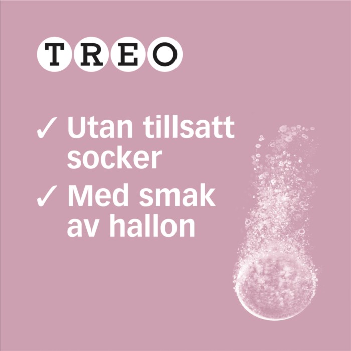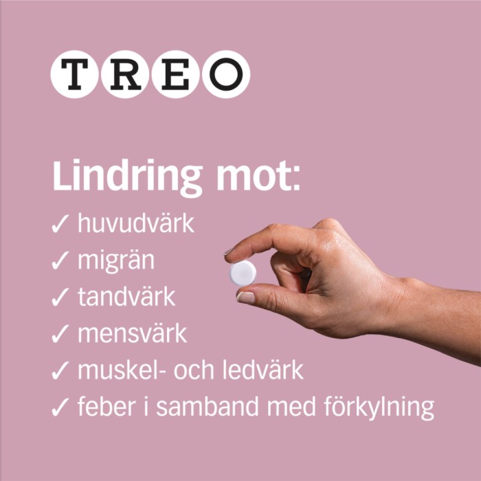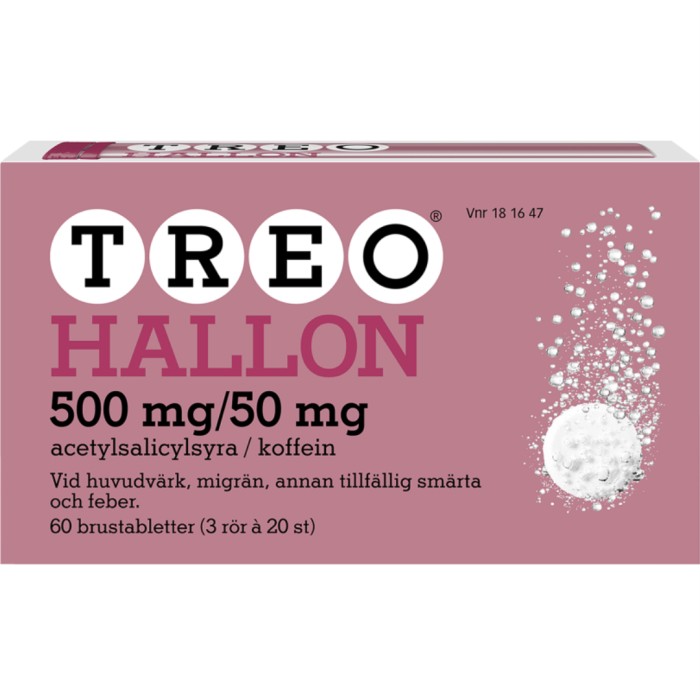 Treo Hallon brustablett 500mg/50mg i 3-pack är ett receptfritt läkemedel mot migrän, huvudvärk, tillfällig smärta och feber. Treo brustablett innehåller 500 mg acetylsalicylsyra och 50 mg koffein – en kombination som ger snabb smärtlindring inom 30 minuter. Treo är smärtstillande, febernedsättande och inflammationshämmande och lindrar vid huvudvärk, migrän, mensvärk, tandvärk, muskelvärk, ledvärk och feber.