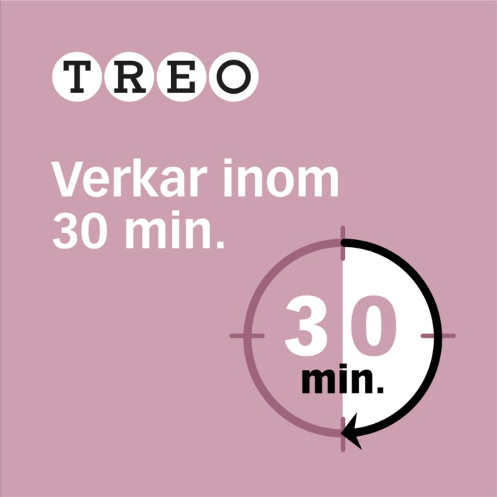 Treo börjar verka inom 30 minuter och är skonsammare mot magen än vanliga fasta värktabletter med acetylsalicylsyra. Effekten är som störst efter 1-2 timmar.