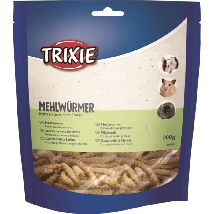 TRiXiE torkade mjölmaskar för allätande små gnagare. Mjölmaskarna är varsamt torkade och är rika på animaliskt protein och fett.