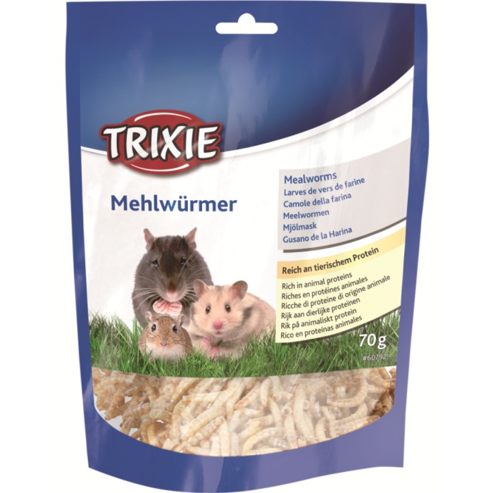 TRiXiE torkade mjölmaskar för allätande små gnagare. Mjölmaskarna är varsamt torkade och är rika på animaliskt protein och fett.