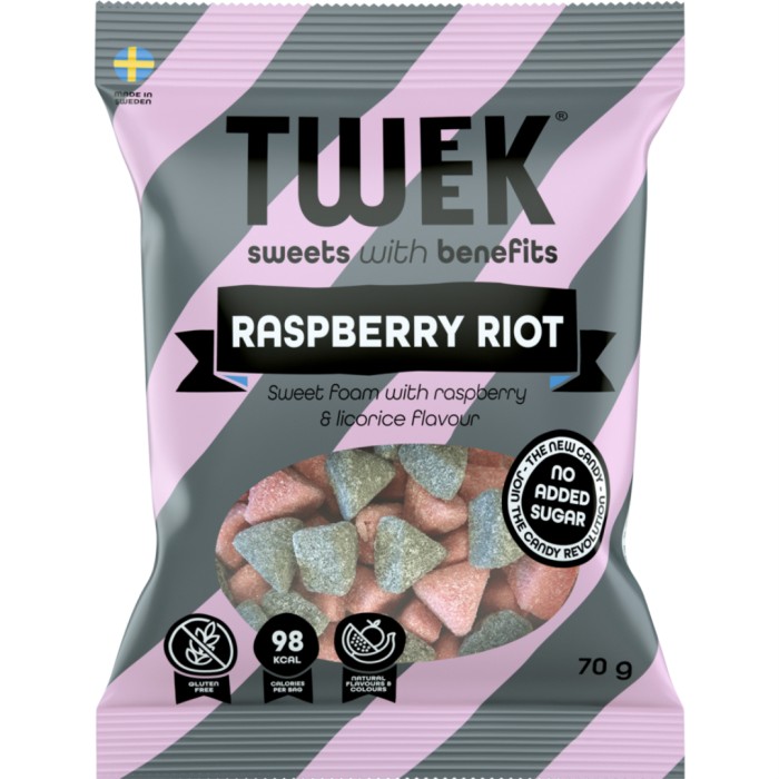Tweek Raspberry Riot är ett mjukt skumgodis med en smak som blandar söta hallon och lakrits. Ett smakrikt godis utan tillsatt socker, fritt från palmolja. Har ett högt fiberinnehåll. Innehåller 100% naturlig färg- och smaksättning som kommer från frukt och grönsaker. Innehåller sötningsmedel.