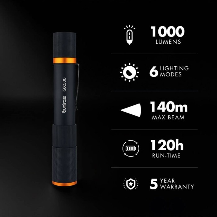 Uniross GX 500 är toppmodellen i Uniross nya lampserie Pro. Denna ficklampa har en ljusstyrka på hela 1000 lumen och har ett vitt och klart sken. Lampan är tillverkad i aluminium för att klara tuffa tag. Den är utrustad med ett praktiskt bältesklipp och är laddbar. Lampan kan lysa upp till 100 timmar på en laddning.