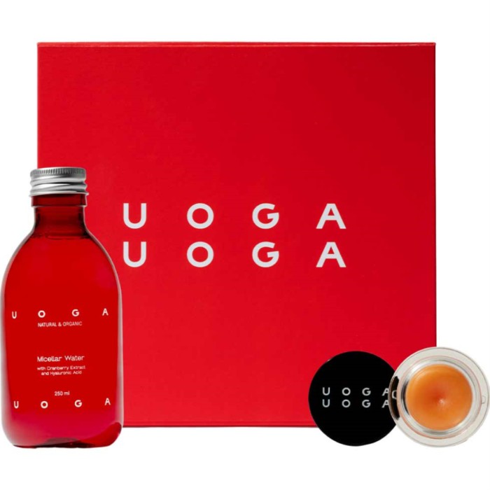 Uoga Uoga Gift Set no. 4 är ett kit med vård för läppar och ansikte. Denna presentbox innehåller två Uoga Uoga-favoriter: den näringsrika JAM-läppmasken (full size) som gör läpparna mjuka och fylliga, samt micellärvatten 100 ml med tranbärsextrakt och hyaluronsyra för att rengöra huden. En duo som passar perfekt för dig som vill kombinera effektivitet med skonsamhet.
