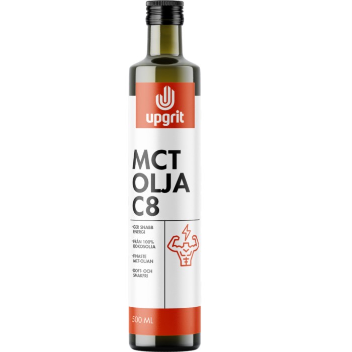 Upgrit C8 MCT-olja är av högsta kvalitet (av 100% kokosolja) och består av den medellånga mättade fettsyran C8. C8 MCT är även kallad kaprylsyra och tas snabbt upp av kroppen, jämfört med andra fetter, och omvandlas till energigivande ketoner. Gjord på 100% kokosolja. Utan smak och doft. Producerad i Europa. Kommer i glasflaska.