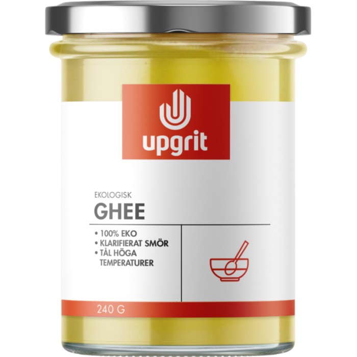 Upgrit Ghee är ett klarifierat smör, framställt av ekologisk komjölk. Ghee är en ren form av skirat smör som kan användas till bakning och matlagning och ger en rik smak.